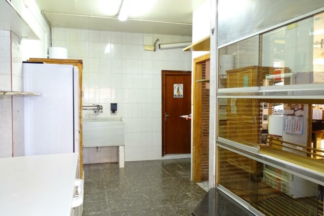 Se compone de 2 escaparates, entrada para proveedores y personal, amplio salón con 2 mostradores para atención al público, un aseo para personal con ducha, una trastienda a modo de almacén y además el equipamiento de máquinas de frío, congelado y horno.